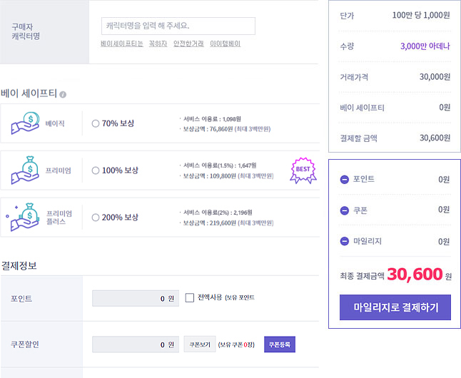 게임머니, 아이템, 계정거래 시 결제 페이지내에 베이 세이프티 상품을 선택하시면 됩니다.